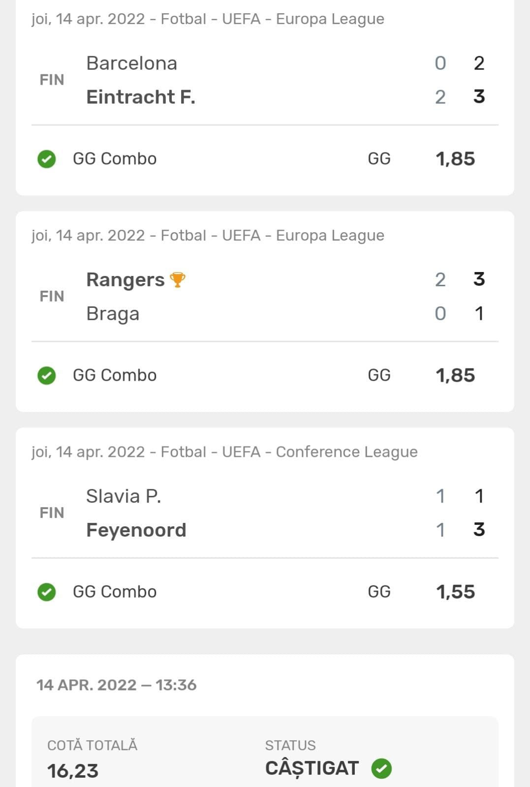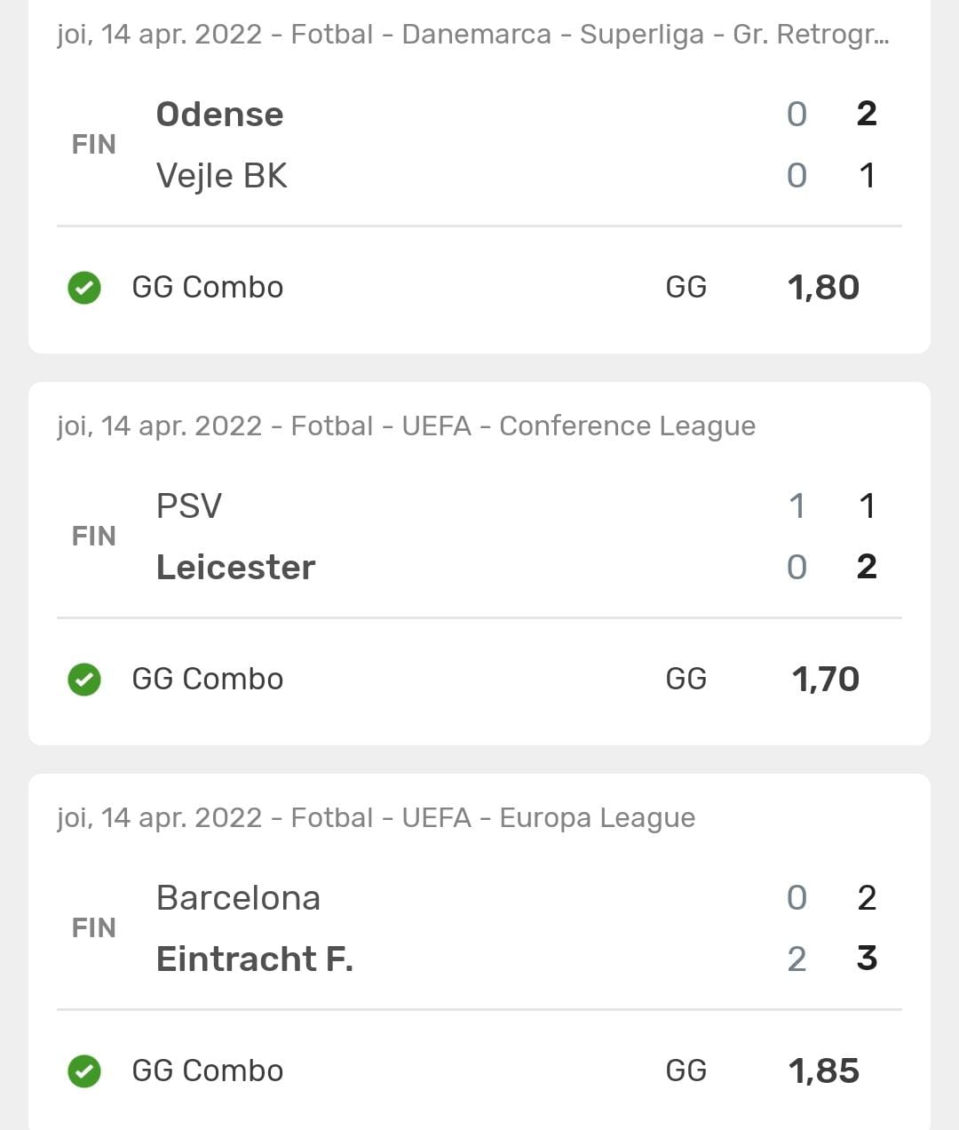 Daniel Nazare a decis să parieze GG(ambele echipe marchează) în următoarele partide: Barcelona Eintracht F. (GG), Rangers – Braga (GG), Slavia P. – Feyenoord (GG), Odense- Vejle Bk (GG), PSV – Leicester (GG).
