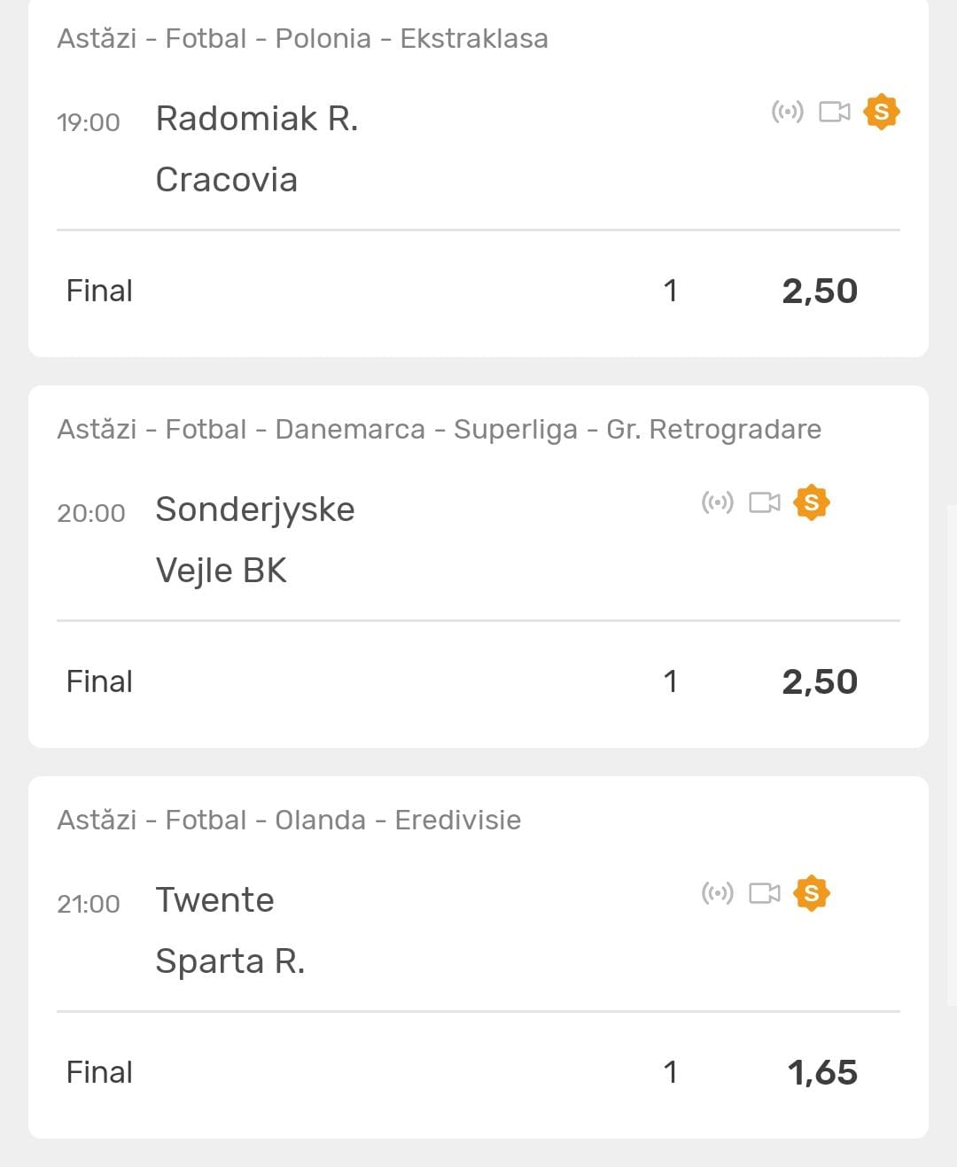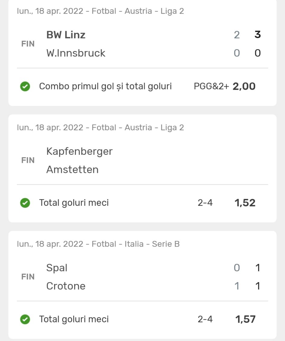 Luni a fost ziua de grație a echipei Sport Total FM, astfel am decis să jucăm pe goluri marcate, după cum urmează: BW Linz – W. Innsbruck (PGG&2+), Kapfenberger – Amstetten (2-4 goluri), Spal – Crotone (2-4 goluri), Middlesbrough – Huddersfield (2-5 goluri), Luzern – St. Gallen (2-5 goluri).