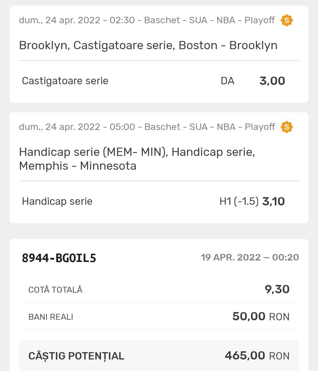 Am pariat pe partida de NBA din SUA, Boston – Brooklyn (Brooklyn câștigătoare serie), partidă ce va decide câștigătoarea de serie. A doua predicție vine tot din SUA, Memphis – Minnesota (H1 -1.5).