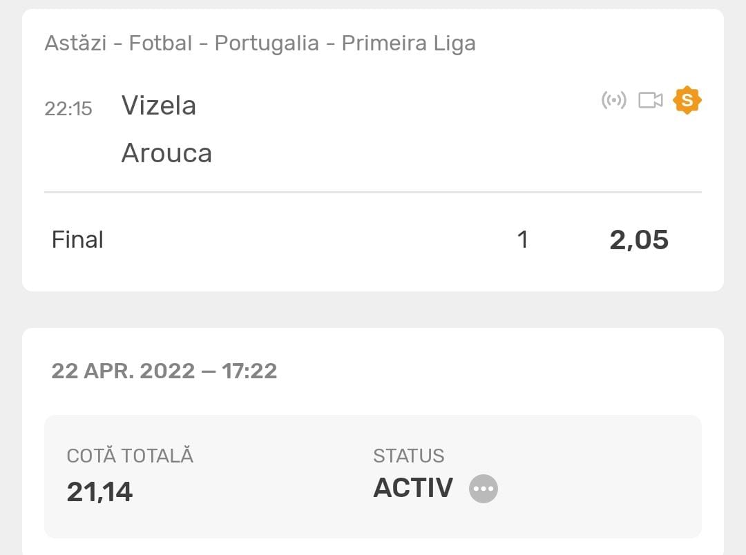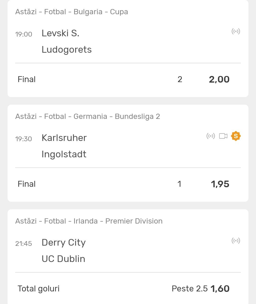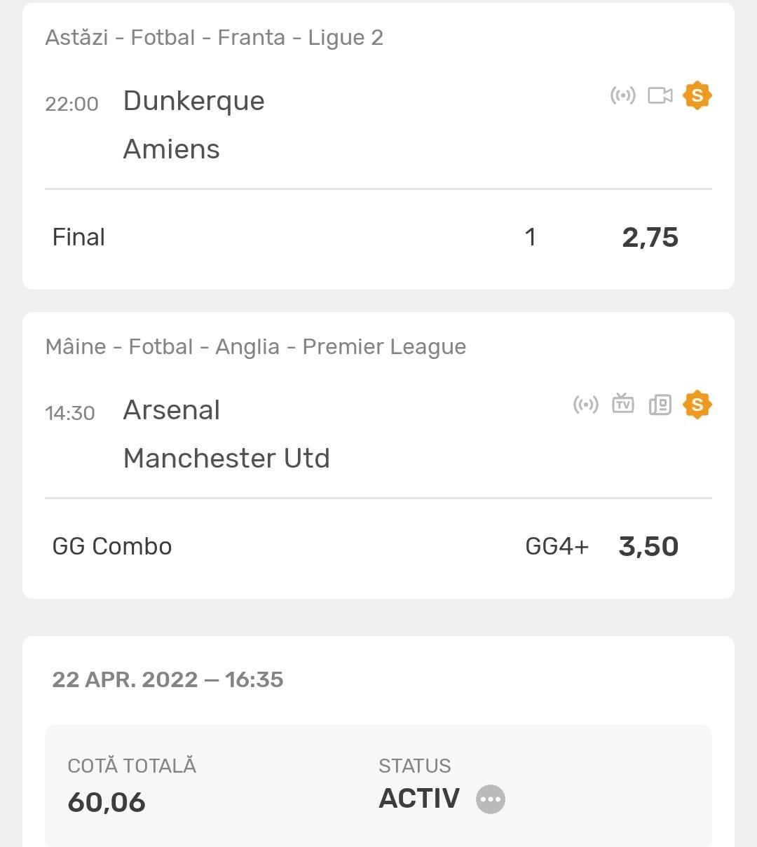 Daniel Nazare a decis să joace dur în acest weekend, mizând astfel pe un bilet cu o cotă totală de 60,6. Acesta a pariat pe următoarele partide: Levski S. – Ludogorets (2), Karlsruher – Ingolstadt (1), Derry City – UC Dublin (peste 2.5 goluri), Dunkerque – Amiens (1), Arsenal – Manchester Utd. (GG4+).