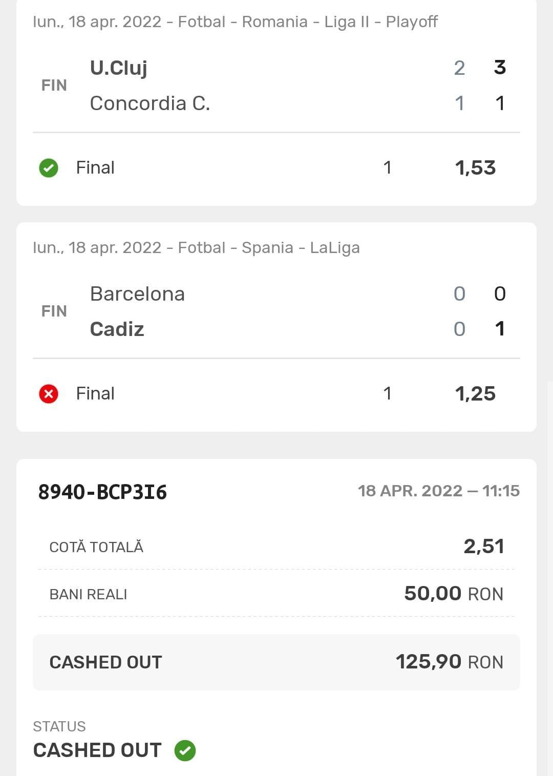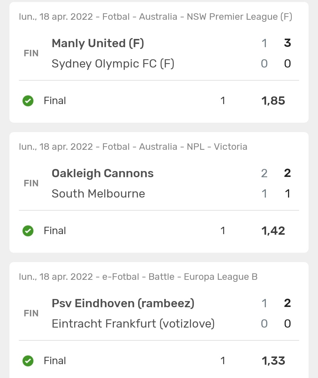 Noi am decis să jucăm luni, 18 aprilie, un bilet sigur, 1 solist. Astfel, am pariat pe următoarele partide: Manly United (F) – Sydney Olimpic FC (F) (1), Oakleigh Cannons – South Melbourne (1), U Cluj – Concordia C. (1), Barcelona – Cadiz (1).
